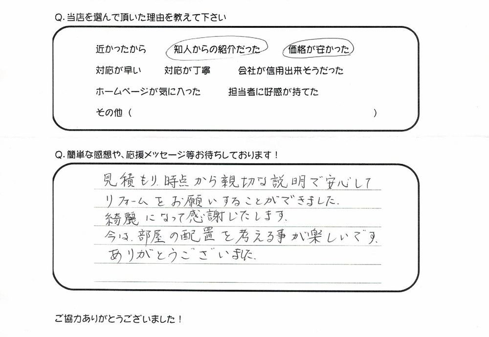 見積もり時点から親切な説明で安心してリフォームをお願いすることができました。